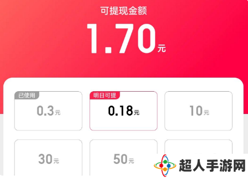 3、提现金额包括:0.3元、0.18元、10元、30元、50元、70元。