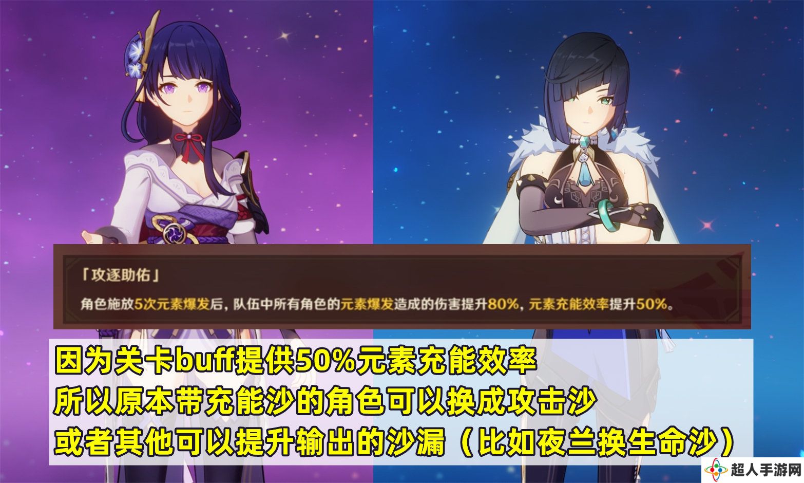 因为关卡buff提供了50%元素充能,加上这关对输出要求较高,所以原本带充能沙的角色,可以换成攻击沙,或者根据角色不同,选择其他可以提升输出的沙漏(比如夜兰换生命沙)。