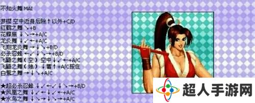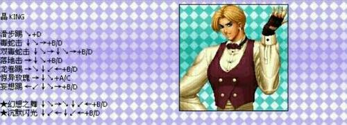 梦樱:(空投)↑以外+C或D红鹤之舞:↓→(这两个键同时按)+B花蝶扇:↓→+A或C龙炎舞:↓←+A或C飞翔龙炎舞:→↓→+B或D必杀忍蜂:←↓→+B或D飞鼠之舞:↓(蓄)↑+A或C(按住不放)飞鼠之舞:(跳跃中)↓←+A或C白鹭之舞:→↓→+A或C超必杀忍蜂:↓←↓→+B或D凤凰之舞:↓←↓←+A或C水鸟之舞:↓→↓→+A或C17.king