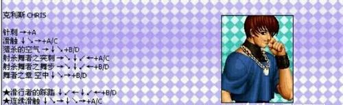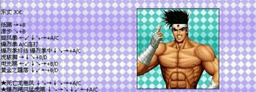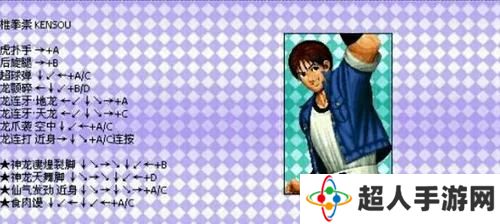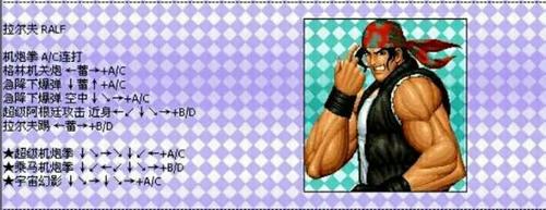 机炮拳:A或C连打格林机关炮:←(蓄)→+A或C急降下爆弹:↓(蓄)↑+A或C急降下爆弹:(跳跃中)↓→+A或C超级阿根廷攻击:(近身)←↓→+B或D拉尔夫踢:←(蓄)→+B或D超级机炮拳:↓→↓←+A或C乘马机炮拳:↓←↓→+B或D宇宙幻影:↓→↓→+A或C经典的拳皇97版本和经典的角色都出来了,选你最喜欢的角色,用拳皇97出招表摇杆,来薄纱你的对手,让他们在你恐怖的实力下颤抖,直接拿出你最喜欢的角色一串三,暴打他!