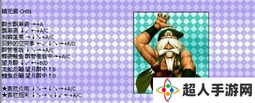 醉步飘箪袭:→+A瓢箪袭:↓←+A或C柳磷蓬莱:→↓→+A或C回转的空突拳:←↓→+B或D(醉管卷翁中→+B或D) 或 望月醉中→+B或D醉管卷翁:↓→+A或C蝶袭鲑鱼:醉管卷翁中→+A或C望月醉:↓←+B或D龙蛇反蹦:望月醉中↑B鲤鱼反蹦:望月醉中↑D鬼醉酒:↓→+A或C轰栏炎炮:↓→↓→+A或C轰栏招来:↓→↓←+A或C15.神乐千鹤