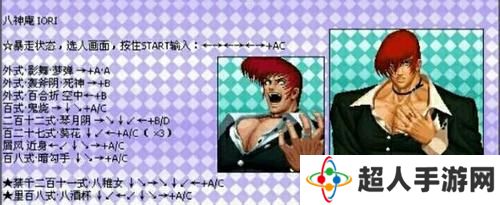 大回转蹴:→+A棒高跳蹴:→+B三节棍中段打:←↓→+A或C火炎三节棍中段打:三节棍中段打中↓→+A或C旋风棍:A键连打集点连破棍:C键连打强袭飞翔棍:→↓→+B或D火龙追击棍:↓←+B水龙追击棍:↓←+D旋元杀棍:→↓→+A或C超火炎旋风棍:↓→↓←+A或C大旋风:↓→↓→+A或C27.八神庵 {暴走八神(按住开始键不放输入←→←→←→+A+C}