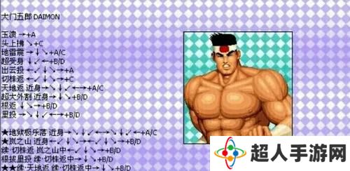 旋转膝落:(空投)↑以外+C或D杰克小刀踢:→+B飞之技巧:(跳跃中)↓+D雷韧拳:↓→+A或C空中雷韧拳:(跳跃中)↓→+A或C真空片手驹:↓←+A或C超级闪电踢:→↓→+B或D居合蹴:↓→+B或D反动三段蹴:→↓←+B或D红丸投:(近身)→↓←→+A或C雷光拳:↓→↓→+A或C大发电者:(近身)→↓←→↓←+A或C3.大门五郎