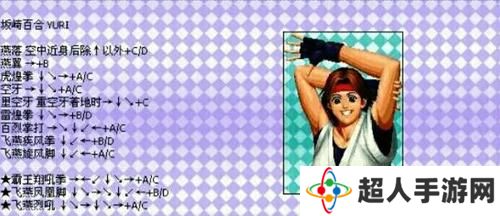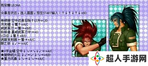 燕落:(空投)↑以外+C或D燕翼:→+B虎煌拳:↓→+A或C空牙:→↓→+A或C里空牙:重空牙着地时→↓→+C雷煌拳:↓→+B或D百烈掌击:→↓←+A或C飞燕疾风拳:↓←+B或D飞燕旋风脚:↓←+A或C霸王翔吼拳:→←↓→+A或C飞燕凤凰脚:↓→↓←+B或D飞燕烈孔:↓→↓→+A或C10.莉安娜 (暴走莉安娜按住开始键不放输入↑↓↑↓↑↓+B+D)