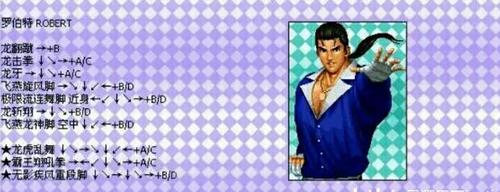 冰柱割:→+A虎煌拳:↓→+A或C虎炮:→↓→+A或C猛虎雷神刚跳跃中:→↓→+A或C飞燕疾风脚:→↓←+B或D极限流连舞拳:(近身)←↓→+A或C猛虎雷神刚:↓←+A或C(击中后可接虎炮)猛虎雷神刹:↓→+B或D龙虎乱舞:↓→↓←+A或C霸王翔吼拳:→←↓→+A或C天地霸王拳:↓→↓→+A或C8.罗伯特
