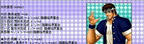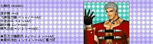 外式·影舞·梦弹:→+A+A外式·轰斧阴·死神:→+B外式·百合折:(跳跃中)←+B百式·鬼燃烧:→↓→+A或C二百十二式·琴月阴:→↓←+B或D百二十七式·葵花:↓←+A或C(可三回连续输入)屑风:(近身)←↓→+A或C百八式·暗勾手:↓→+A或C禁千二百十一式·八稚女:↓→↓←+A或C ……哭吧,叫吧,然后就死吧!里百八式·八酒杯:↓←↓→+A或C28.矢吹真吾