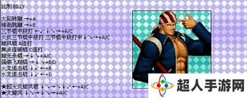 打刺:→+A蛇使·上段:↓←+A(可蓄)蛇使·中段:↓←+B(可蓄)蛇使·下段:↓←+C(可蓄)蛇使取消:蛇拳蓄劲中D施虐:←↓→+B或D倍返:↓→+A或C制裁之首:→↓→+A或C爆弹:(近身)←↓→+A或C踢砂:→↓→+B或D断头台:↓→↓→+A或C射杀:(近身)→↓←→↓←+A或C(A+C连打蓄力) ……(完结时)你死定了!26.比利