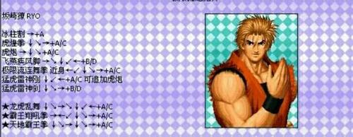 低踢:→+B滑步:↓→(这两个键同时按)+B旋风拳:←↓→+A或C爆烈拳:A或C连按爆烈拳终结:爆烈拳中↓→+A或C虎破脚:→↓→+B或D电光踢:←↓→+B或D黄金之踵落:↓←+B或D死亡龙卷风:↓→↓→+A或C爆烈飓风猛虎踢:↓→↓←+A或C7.坂崎良