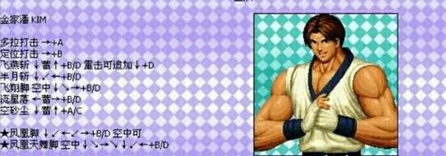 滑步踢:↓→(这两个键同时按)+D毒蛇击:↓→+B或D双毒蛇击:↓→↓→+B或D落地击:→↓→+B或D龙卷踢:→↓←+B或D惊异玫瑰:→↓→+A或C妄想踢:→↓←+A或C幻想之舞:↓→↓←+B或D沉默闪光:↓←↓←+B或D18.金家藩