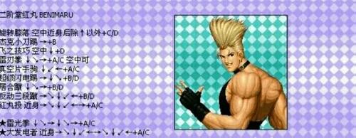 外式·轰斧阳:→+B外式·奈落落:(跳跃中)↓+C八十八式:↓→(这两个键同时按)+D百式·鬼燃烧:→↓→+A或C七百七式·独乐屠:←↓←+B或D二百十二式·琴月阳:→↓←+B或D七十五式改:↓→B+B或D+D百十四式·荒咬:↓→+A百二十八式·九伤:荒咬动作中↓→+A或C百二十七式·八锖:荒咬动作中→↓←+A或C荒咬→九伤动作中A或C百二十五式·七濑:荒咬→九伤动作中B或D外式·砌穿:荒咬→八锖动作中A或C百十五式·毒咬:↓→+C四百一式·罪咏:毒咬动作中→↓←+A或C四百二式·罚咏:罪咏动作中→A或C九百十式·鹤摘(外式+虎伏/龙射):↓←+A或C里百八式·大蛇剃:↓←↓→+A或C最终决战奥义·无式:↓→↓→+A或C2.二阶堂红丸