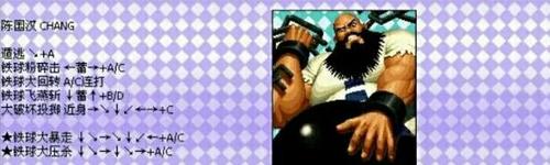 多拉打击:→+A定位打击:→+B飞燕斩:↓(蓄)↑+B或D(接↓B或D)半月斩:↓←+B或D飞翔脚:(跳跃中)↓→+B或D流星落:←(蓄)→+B或D空砂尘:↓(蓄)↑+A或C凤凰脚:↓←↓→+B或D(跳跃中可)凤凰天舞脚:(跳跃中)↓→↓←+B或D19.陈国汉