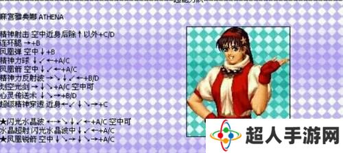 跳入死亡湖:(空投)↑以外+C或D断踢:→+B机炮拳:A或C连打凝固汽油弹:→↓→+A或C旋转摇篮:←↓→+A或C弗兰肯必杀投:→↓→+B或D超级阿根廷阻挠者:(近身)←↓→+B或D烈火闪光肘:(指令投中)↓→+A或C终结阿根廷攻击:(近身)→↓←→↓←+A或C奔袭投掷:←↓→←↓→+B或D12.麻宫雅典娜