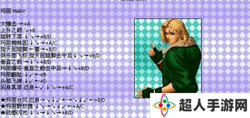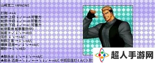 大锤击:→+A上升之箭:↓→(这两个键同时按)+B旋转下落:↓→+B或D玛丽蜘蛛固:↓→+A或C指天回旋脚:←(蓄)→+B或D俱乐部飞标:指天回旋脚击中后↓→+B或D垂直之箭:→↓→+B或D玛丽攫夺:垂直之箭击中后→↓→+B或D玛丽翻脸:↓←+B头部飞弹:↓←+D回身真落:(近身)←↓→+A或C玛丽台风:(近身)→↓←→↓←+B或D玛丽野玫瑰:↓→↓←+A或C动感闪光:↓→↓→+B或D25.山崎龙二
