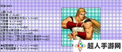 后打:→+A步步高:↓→(这两个键同时按)+C火焰冲拳:↓←+A或C能量波:↓→+A或C碎石踢:↓←+B或D倒跃踢:→↓→+A或C灌篮强击:→↓→+B或D能量补充:←↓→+B或D能量喷泉:↓←↓→+A或C高轨喷泉:↓→↓→+B或D5.安迪