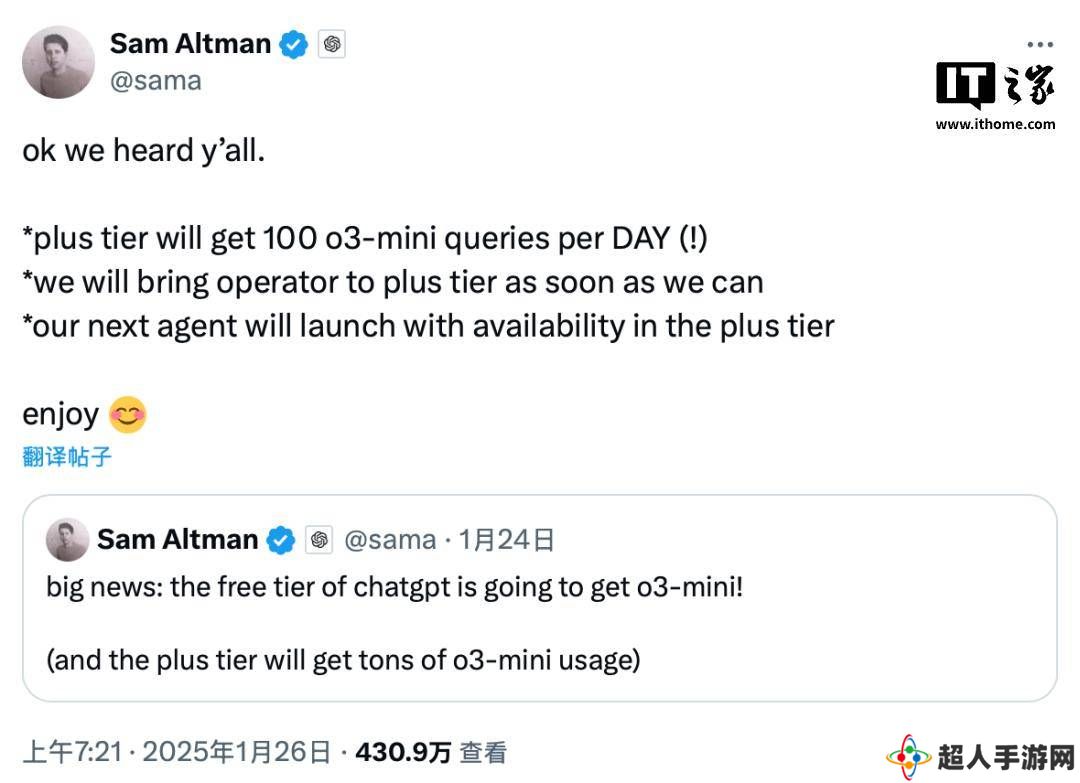 面对DeepSeek等竞争对手的压力,OpenAI的CEO阿尔特曼也表示将采取一系列措施来优化成本和提升用户体验。他透露,未来的ChatGPT o3-mini模型将开放给免费用户使用,Plus会员则每天有100条请求的额度。同时,新的ChatGPT Operator功能也将尽快向Plus会员开放。